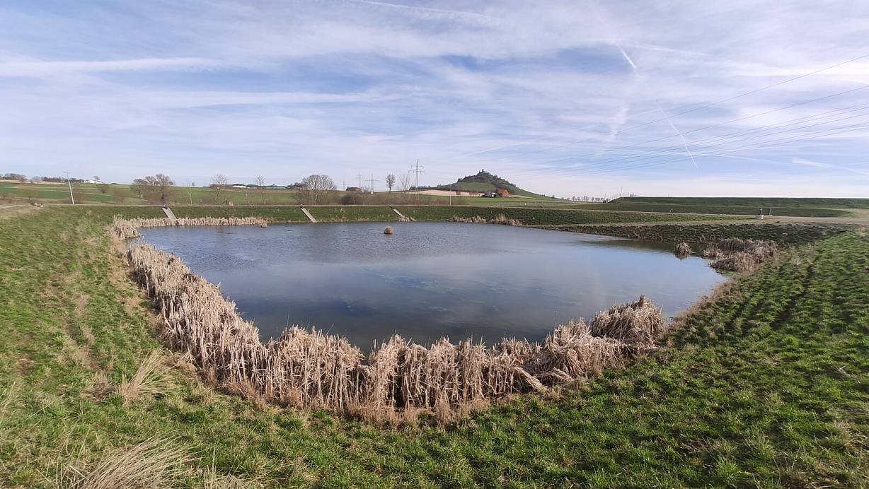 Eine schwierige Situation für die Vogelrettung: Mitten auf dem Wasser einer der Schlammteich-Becken oberhalb des ehemaligen Werksgeländes harrt ein Höckerschwan mit einem verletzten Flügel der Dinge. | © Manfred Hölker