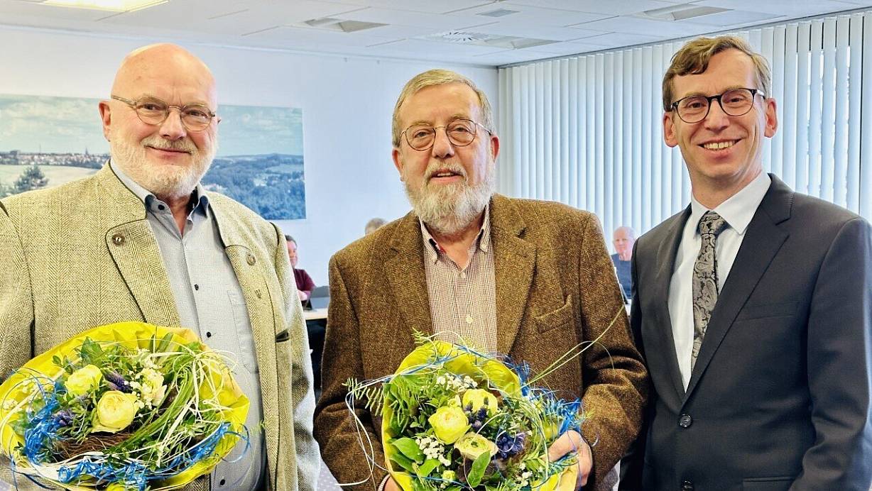 Blumen zum Abschied: Ulrich Nolte (v. l.), Franz Freitag und Bürgermeister Tobias Scherf. | © Dieter Scholz