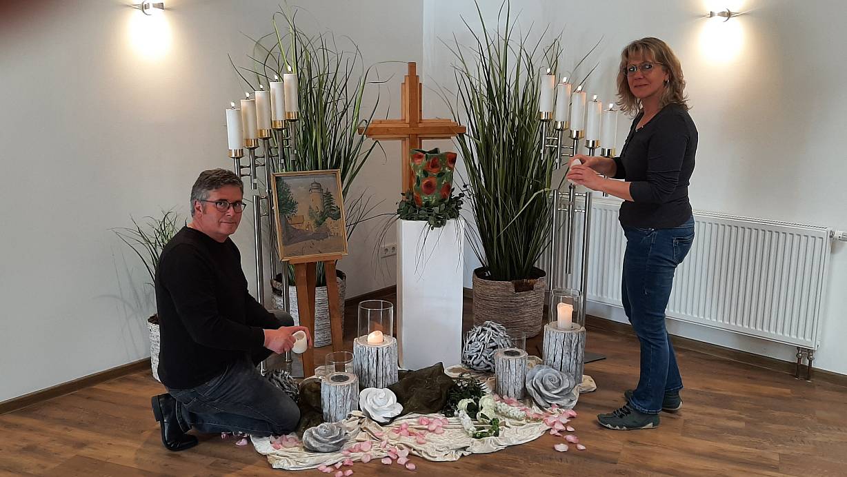 Holger und Annette Wilhelm zünden die Kerzen an. Die ausgestellte Urne mit der Aschenkapsel ist aus Filz, handgefertigt in Warburg. | © Dieter Scholz