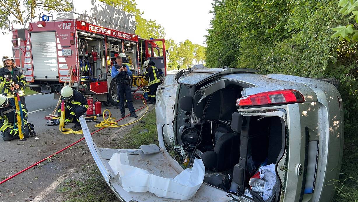 Die Feuerwehr musste das Dach des auf der Seite liegenden Fahrzeugs öffnen, um die verletzte Fahrerin zu befreien. | © Feuerwehr Volkmarsen