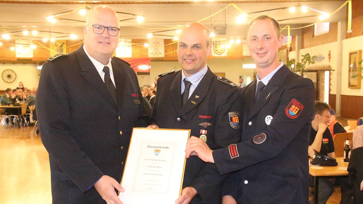 Der stellvertretende Kreisbrandmeister Jürgen Schmits (v. l.) überreicht Löschgruppenleiter Thorsten Dierkes Stellvertreter Dominik Hengst die Ehrenurkunde zum 100-jährigen Bestehen der Löschgruppe Bühne. | © Burkhard Battran