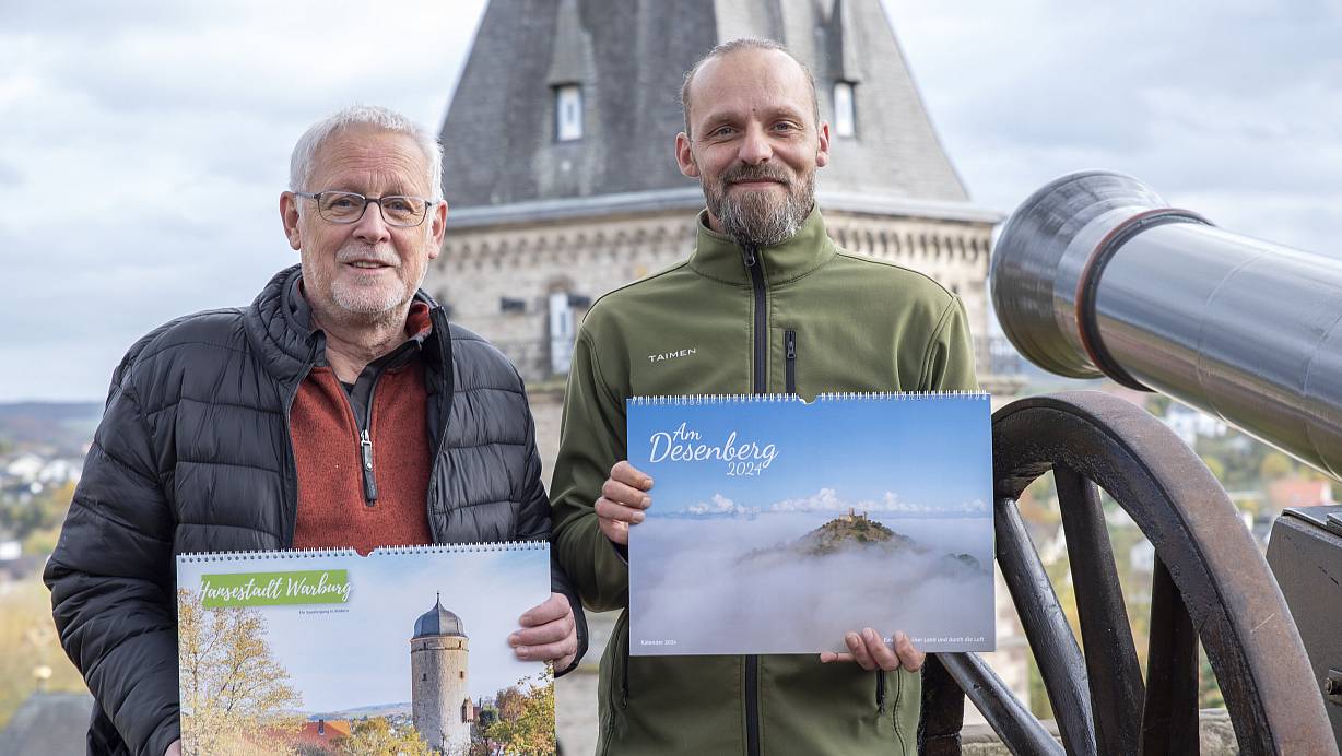 Ruben Emme (r.) und Karl-Heinz Wiemers bringen ihre Fotokalender mit Motiven vom Desenberg und aus Warburg heraus. Sie sind ab sofort erhältlich. | © True Design/Miriam Emme