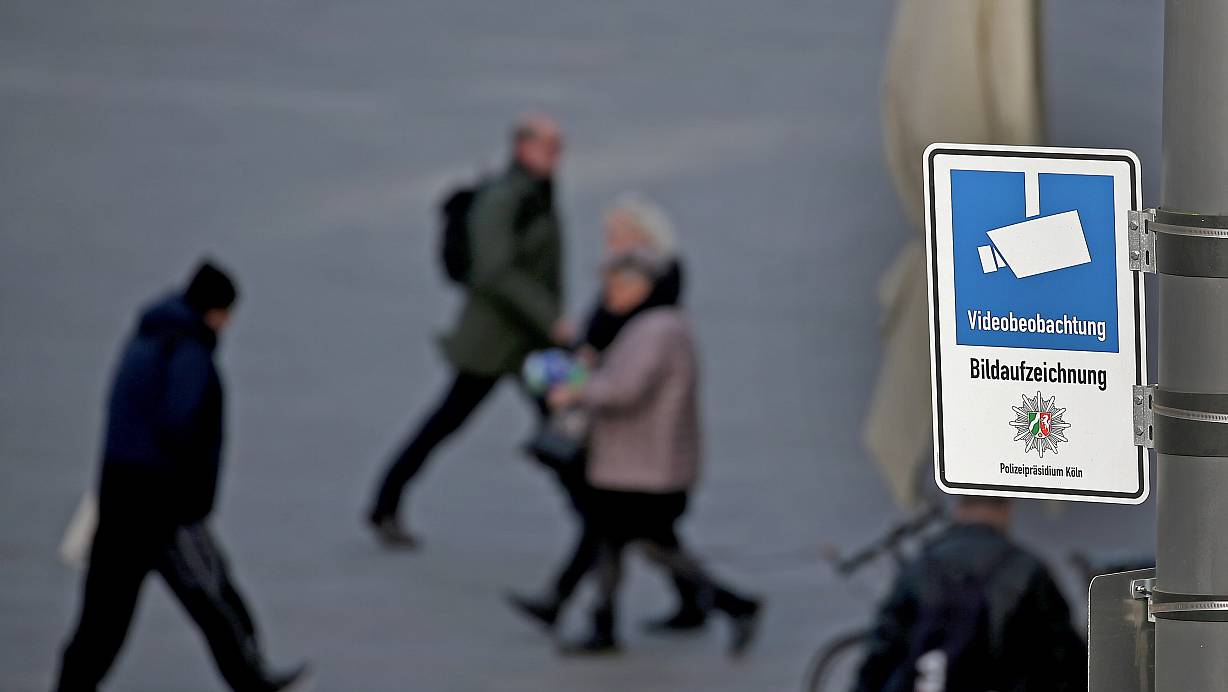 Dieses Hinweisschild mit der Aufschrift „Videobeobachtung“ und „Bildaufzeichnung“ hängt vor dem Kölner Hauptbahnhof. Längst gibt es an immer mehr Stellen Kameras, die rund um Gebäude das Geschehen beobachten. | © dpa/Oliver Berg