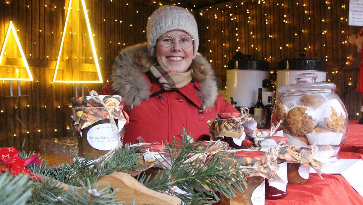 Bei Josette van der Plas-Schaeffer (49) dreht sich alles um den Apfel. Apfelmarmelade, Apfel-Muffins und Apfelpunsch. Die Apfelfreundin macht auch nicht irgendeine Apfelmarmelade, sondern Bratapfelmarmelade. „Die passt besonders gut in die Adventszeit“, sagt Plas-Schaeffer. Im Unterschied zur herkömmlichen Apfelmarmelade kommt nicht alles in einen Topf, sondern der Zucker wird in einem zusätzlichen Arbeitsschritt erst karamellisiert und wieder abgelöscht, bevor die Äpfel hinzugegeben und die Marmelade gekocht wird.