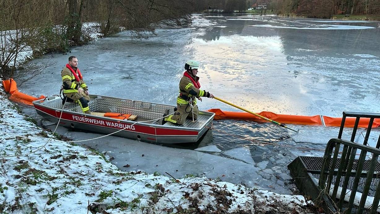 Eine größere Menge Diesel ist auf dem Klostergelände in den Hardehausener See gelaufen. Die Feuerwehr ist schnell zur Stelle. Auch beim Brakeler Siechenbach hilft die neue Technik aus Warburg.