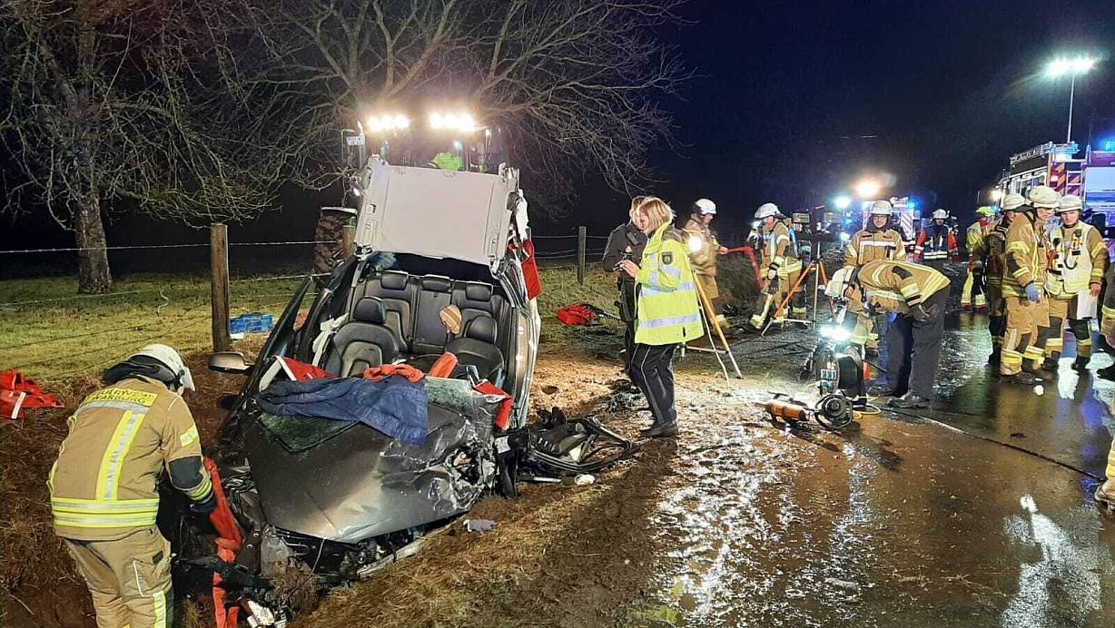 In der Nacht zu Sonntag stoßen auf der K15 drei Fahrzeuge zusammen. Ein Mann stirbt, sieben Personen werden schwer verletzt. Knapp 100 Einsatzkräfte vor Ort.
