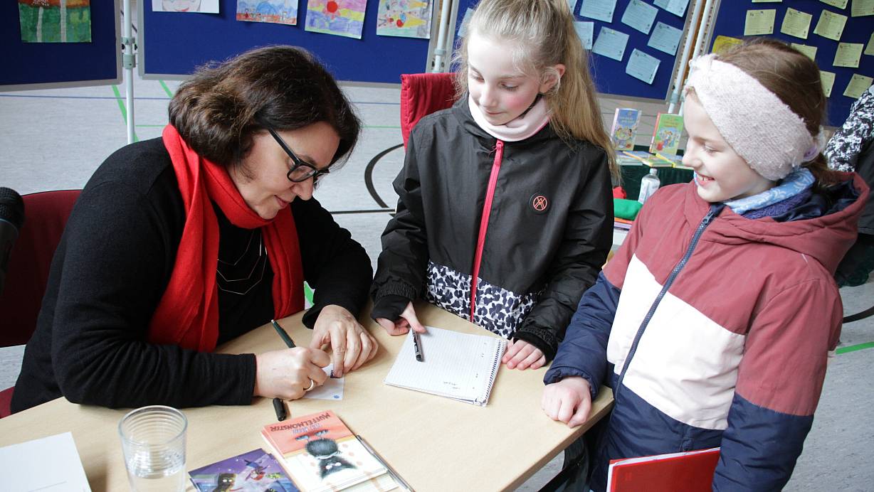 Kinderbuchautorin Julia Boehme schreibt nach der Lesung in der Turnhalle für Lina und Xenia Autogramme. | © Dieter Scholz