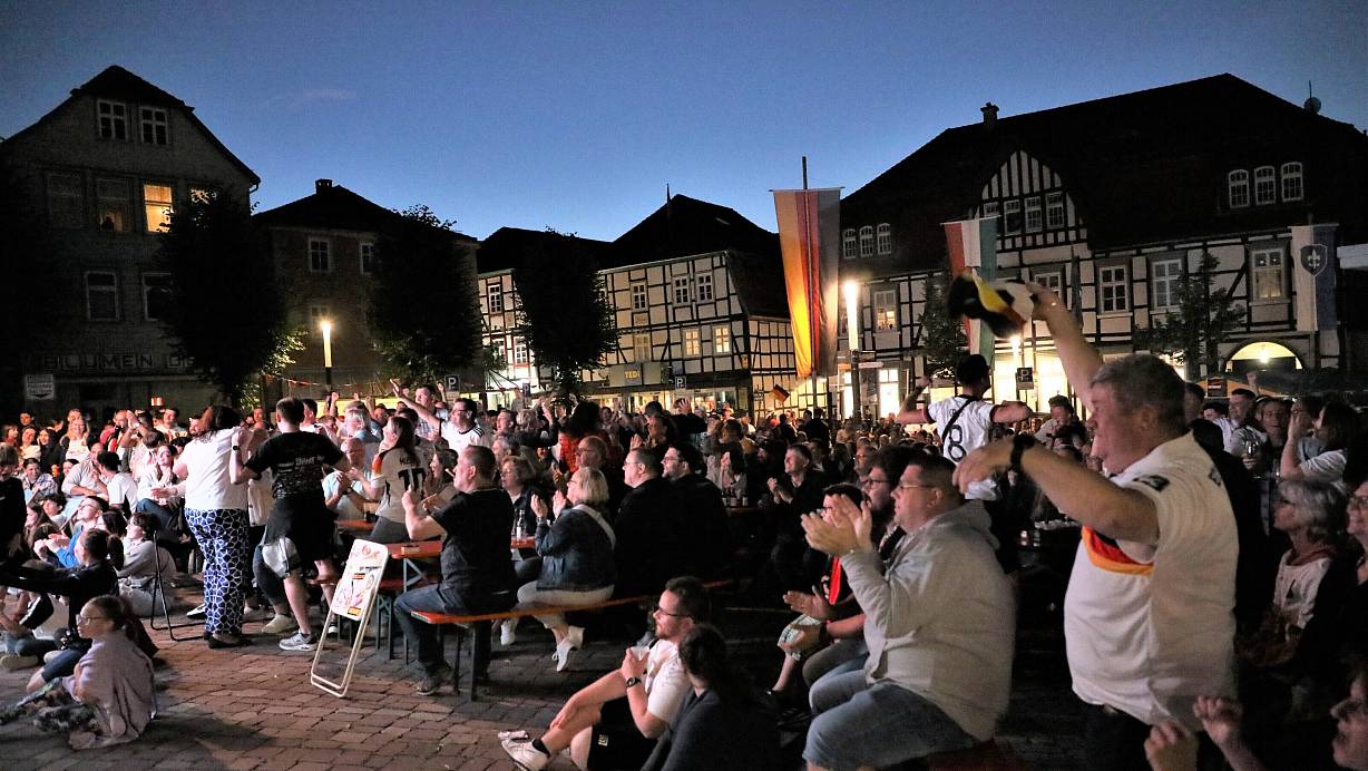 Der Jubel nach dem Ausgleich beim Rudelgucken gegen die Schweiz auf dem Neustadt-Marktplatz in Warburg. | © Simone Flörke