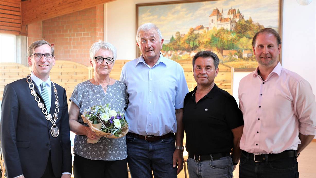 Bürgermeister Tobias Scherf (v. l.), Marlies und Heinz-Josef Bodemann sowie die beiden stellvertretenden Bürgermeister Toni Güthoff und Alexander Neumann. Im Hintergrund das Wandbild vom Calenberger Schloss. | © Simone Flörke