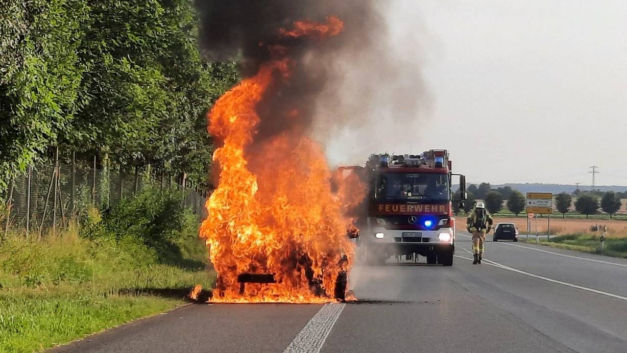 Die Fahrerin kann sich noch rechtzeitig in Sicherheit bringen, doch ihr Fahrzeug wird ein Raub der Flammen.