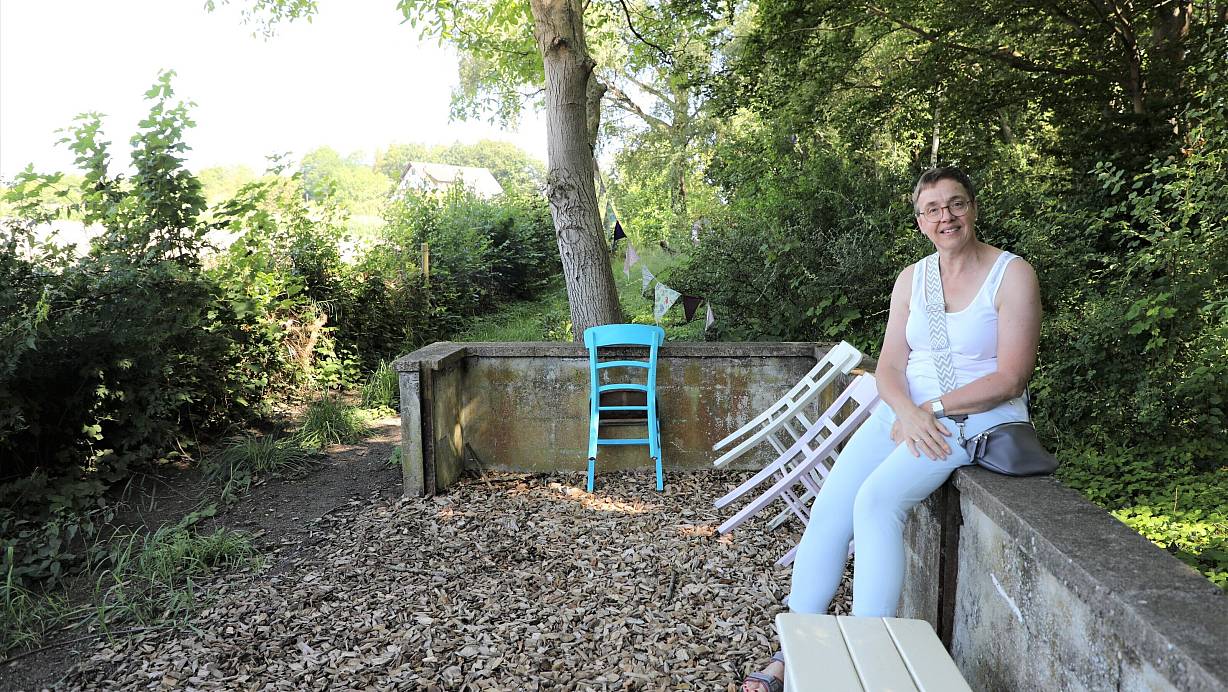 Barbara Hucht am Himmelsplatz, einer Art Outdoor-Klassenzimmer, das mit Leben und Ideen gefüllt werden soll. Es liegt sehr versteckt hinter dem ehemaligen Park der Schwestern von Haus Maria. | © Simone Flörke