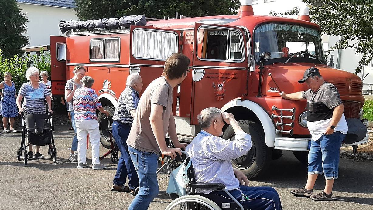 Markantes Gesicht: Ein Mercedes-Kurzhauber, Baujahr 1969, weckt das Interesse der Senioren im Lindenhof. Das ehemalige Feuerwehrfahrzeug hatten sich ein gelernter Kfz-Schlosser und eine Altenpflegerin als Wohnmobil ausgebaut. | © Dieter Scholz