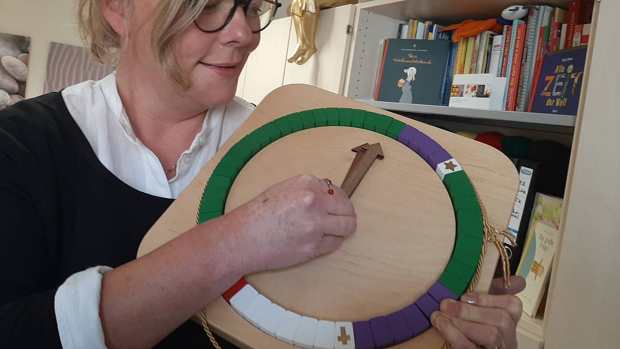 Die Farben unterteilen das Jahr und geben Orientierung. Christina Bolte, Gemeindereferentin im Pastoralen Raum Warburg, richtet den Zeiger auf die kommenden Wochen bis zum Weihnachtsfest. | © Dieter Scholz