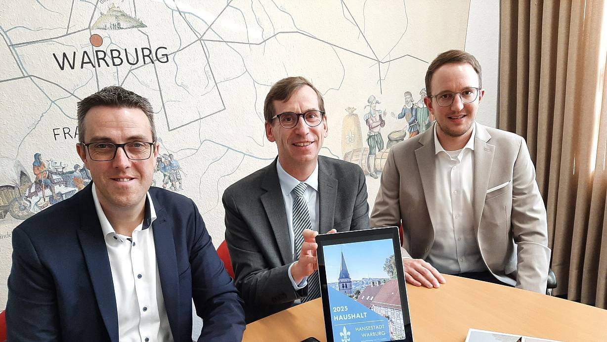 Bürgermeister Tobias Scherf und Kämmerer Andreas Niggemeyer bringen im Warburger Stadtrat ihren Entwurf für 2025 ein. Unter anderem schlagen sie vor, den Bürgerservice deutlich auszubauen.