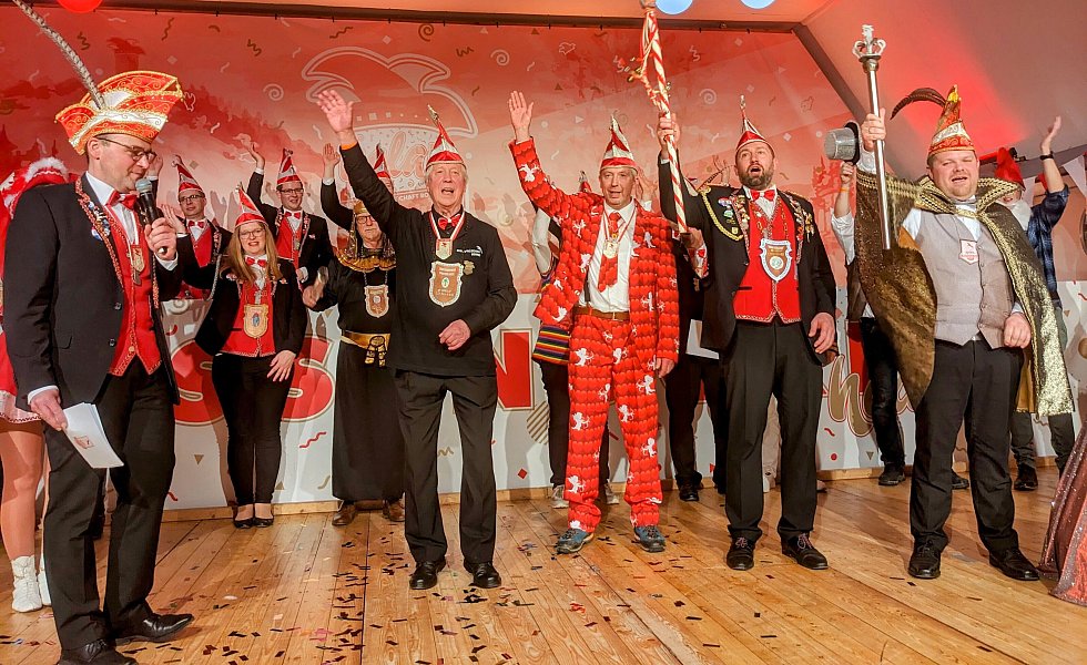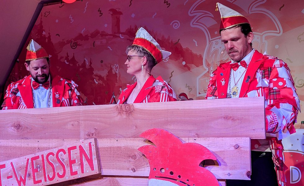 Darüber hinaus wurde örtliches Geschehen erneut von dem Bütten-Trio der Rot-Weißen Lumpen aufs Korn genommen. Bestehend aus Thomas Fuest, Matthias Fischer und Christoph Engemann, hatte sich in diesem Jahr für den erkrankten Christoph Engemann Prinzessin Verena Thonemann in den rot-weißen Lumpenfrack geworfen. Gemeinsam verliehen sie mit dem Lumpi als kleinem Bruder des Cochumers, weitere Orden des Missgeschicks.