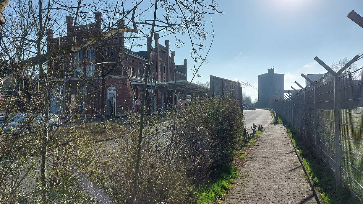 Heute: Die Blickachse entlang des Warburger Bahnhofs zum Zuckersilo der ehemaligen Zuckerfabrik. Ein Zaun trennt die beiden Bereiche. | © Dieter Scholz
