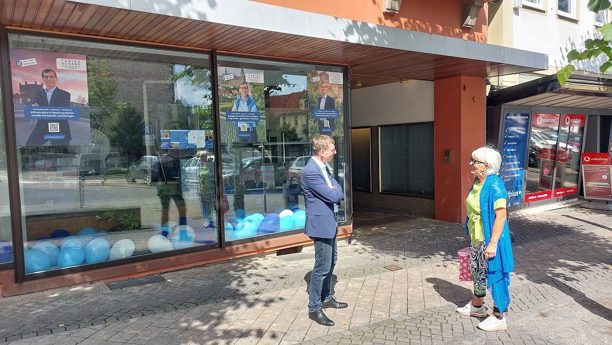 Im Gespräch mit dem Bürger, hier eine Bürgerin: Tobias Scherf vor seiner Wahlkampfzentrale an der Marktstraße in Warburg. | © Dieter Scholz