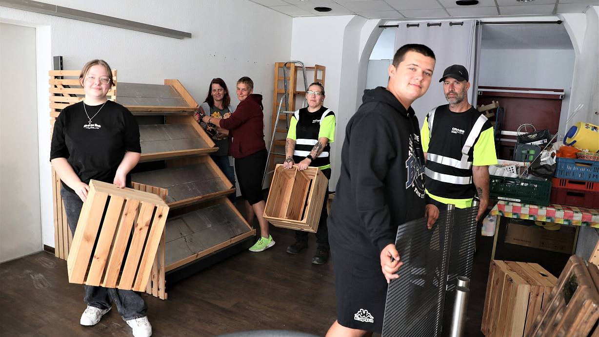 Das Team räumt den Laden aus: Vicky Reinberg (v. l.), Kristin Bruns, Kathrin Ise, Tanja Reinberg sowie Marc und Frank Ise bauen die Einrichtung ab. | © Simone Flörke