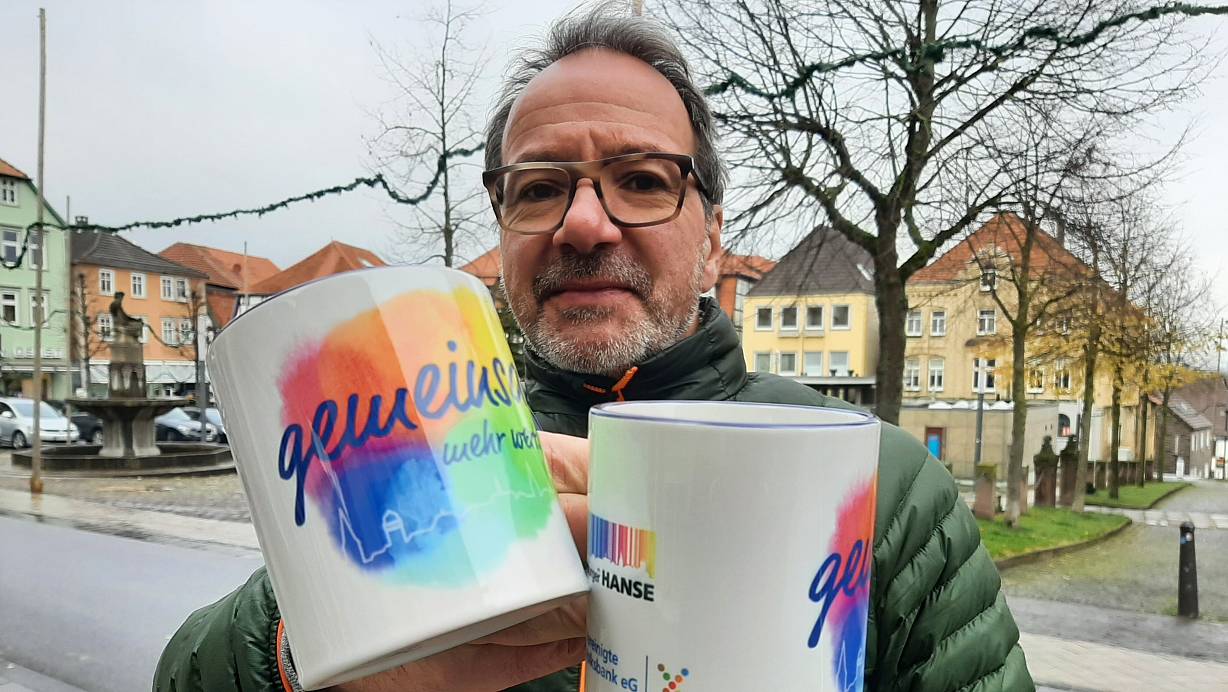Zum Weihnachtsmarkt in der Neustadt im Vorjahr hatte Wilm Pollmann von der Lenkungsgruppe der Warburger Hanse eigens aufgelegte Tassen vorgestellt. Mit der Aufschrift „Gemeinsam mehr wert“ werben sie für Warburg. | © Dieter Scholz/Archiv