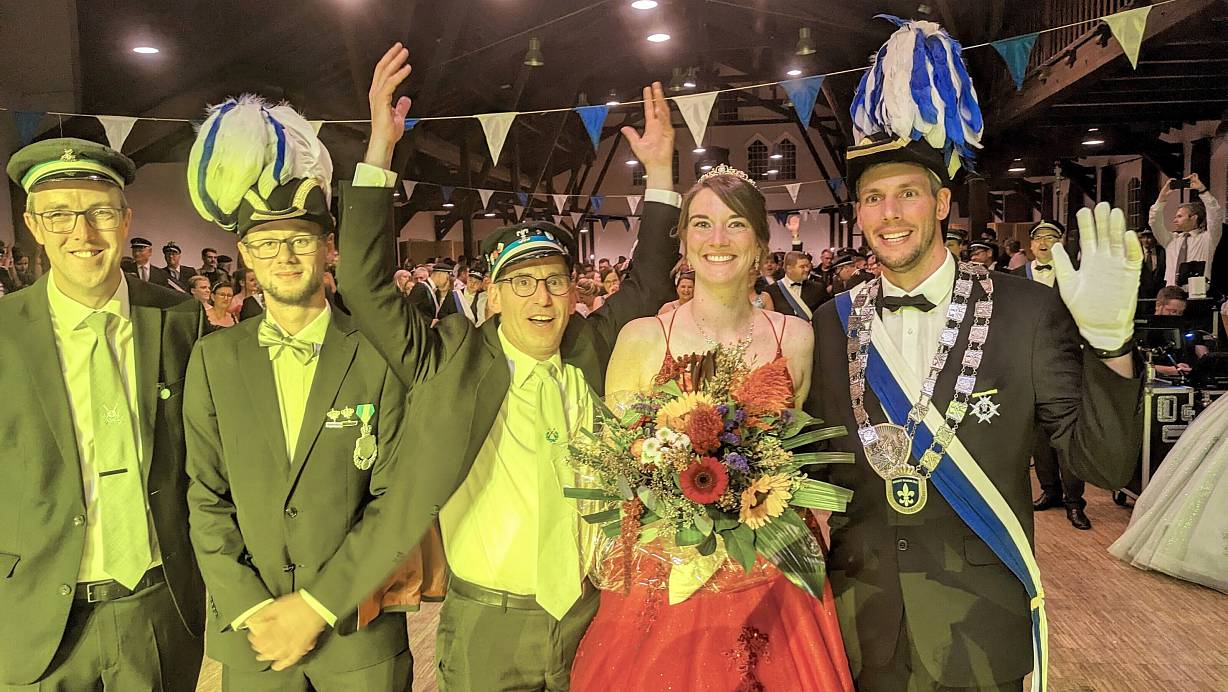 Der Beigeordneter Andreas Niggemeyer, der alte Stadtkönig Daniel Otto und Bürgermeister Tobias Scherf gratulieren dem neuen Stadtkönigspaar Carolin und Magnus Berlage aus Hohenwepel. | © Burkhard Battran