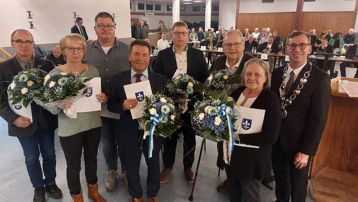 Bürgermeister Tobias Scherf (r.) verabschiedete Gerhard Rose (v. l.), Gabriele Daly, Ansgar Bodemann, Anton Güthoff, Daniel Strathaus, Wolfgang Gumm und Annegret Borm in der Nörder Schlaun-Halle aus dem Warburger Stadtrat. | © Dieter Scholz