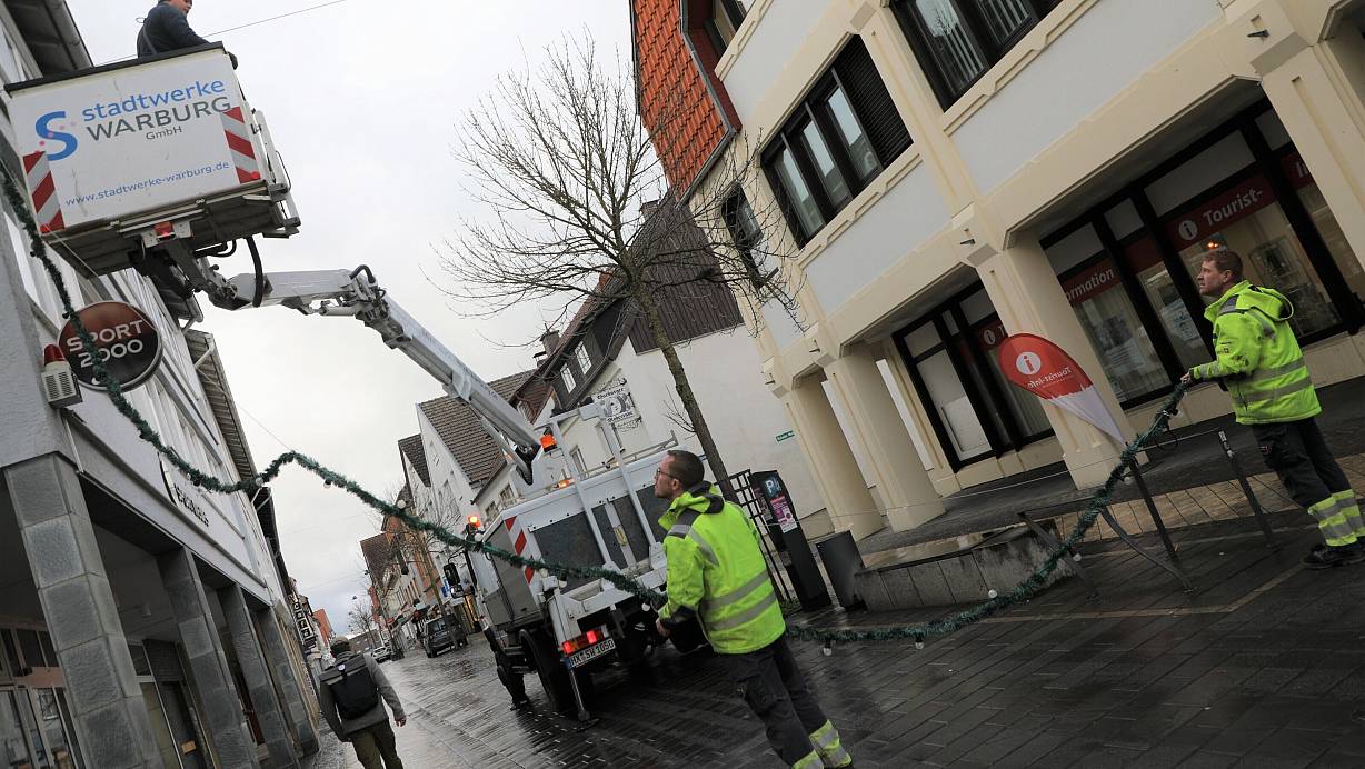 Warburg. Es weihnachtete schon in Warburg. Zumindest ein bisschen. Die ersten Lichterketten über den Straßen in der Kernstadt hängen. Am Montag waren Manuel Peine, Kai Jonietz und Kevin Branke von den Stadtwerken in der Hauptstraße mit dem Hubsteiger unterwegs und hängten von unten bis oben über der Straße die Ketten an den Fassaden der Gebäude auf – unter Vollsperrung der Straße. Am Dienstag ging es im Bereich Sternstraße und runter zum alten Rathaus weiter.