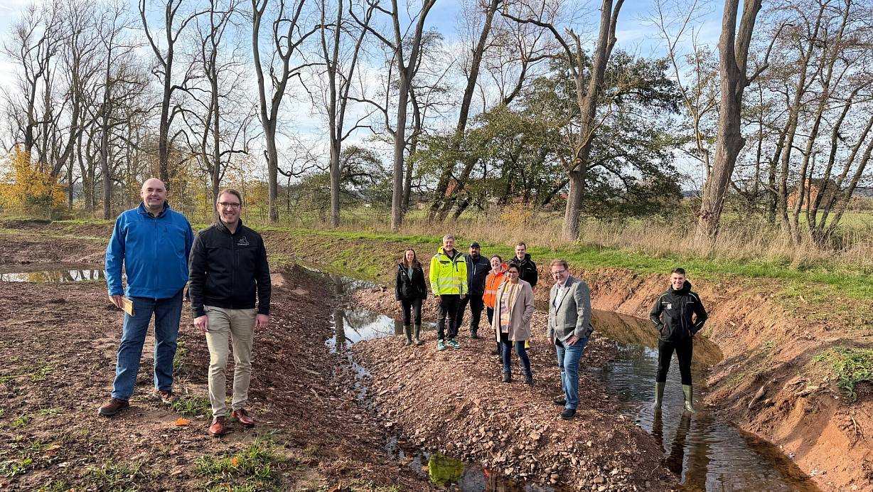 Ortstermin am renaturierten Bachlauf der Twiste im Bereich des Volkmarser Stadtbruchs: Volkmarsens Bauamtsleiter Bernd Pfeiffer (v. l.), Bürgermeister Hendrik Vahle, Maren Falb vom Regierungspräsidium Kassel, Ingenieur Oliver Spohr, Sven Kalenka, Judith Graef und Nicole Lippehardt vom Wasserverband, Tim Lieberknecht (RP), Verbandsvorsteher Thomas Ackermann und Marcel Jänicke (RP).