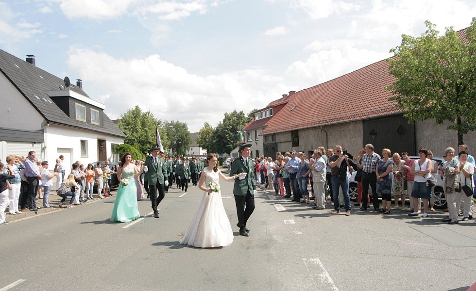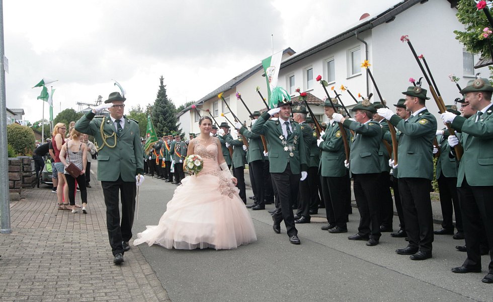 Eissen (kat). Einen großen Bogen machte der Regen am Sonntag um Eissen – und so konnte das Publikum das strahlend schöne Königspaar der Liborius Schützen auf dem großen Festumzug gebührend bewundern. Florian Bosser (28 ) und seine Königin Ines (28) erhielten begeisterten Applaus. Die Königin kam in einem Traum in Rosa daher, einem mit viel Tüll verzierten und Strass bestickten Kleid.