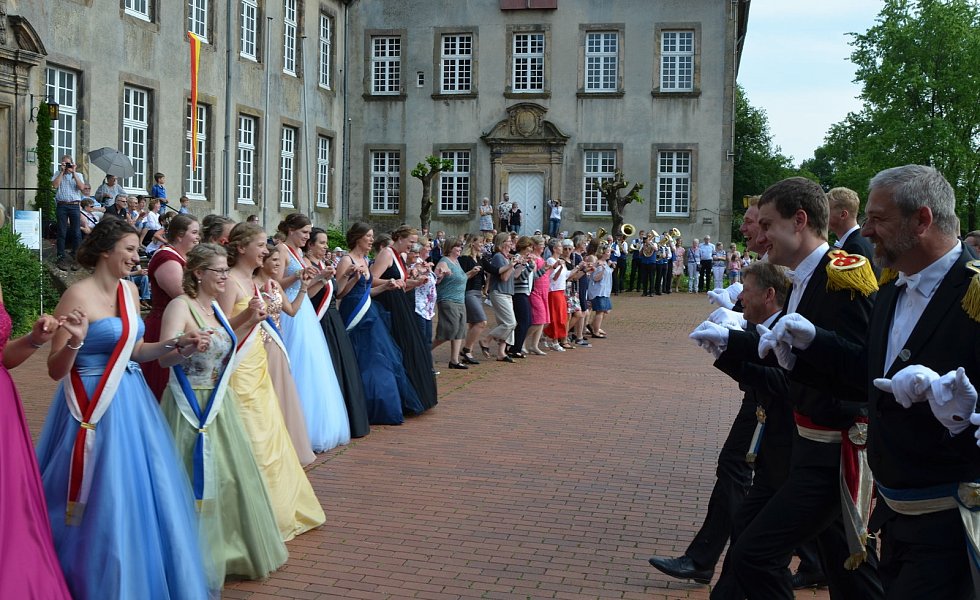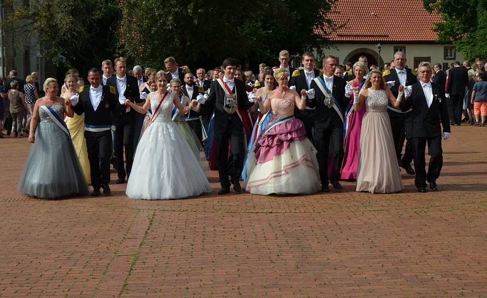 Höhepunkte des Schützenfestes waren neben den Festumzügen am Wochenende die traditionelle Polonaise am Samstag auf dem Schlosshof und die Ehrungen ehemaliger Königspaare der Sebastianer durch den Vereinsvorstand. und der Vorbeimarsch am Ehrenmal am Sonntag.