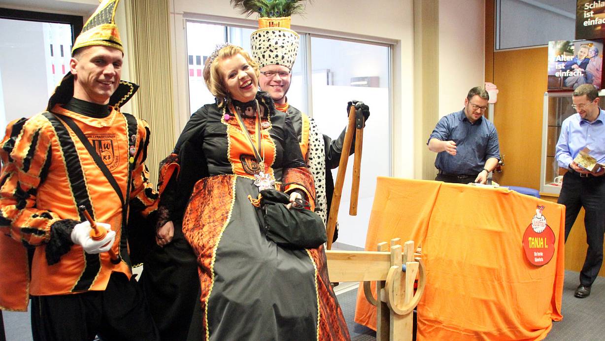 Prinz Sascha Baumann (v. l.), Jungfrau Tanja Baumann und Bauer Manuel Bachmann mit den Sparkassen-Vertretern Mathias Meier und Burkhard Esser, die den Korb der Wippe mit Bonbons füllen. | © Burkhard Battran