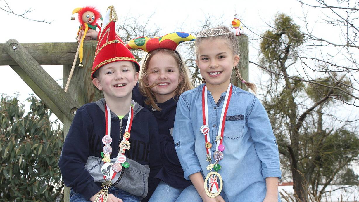 Ein närrisches Trio: Prinz Jonas (8), Hofnärrin Ida (9, Mitte) und Prinzessin Klara (9) sind bereit für die bunte fünfte Jahreszeit. | © Saskia Jochheim