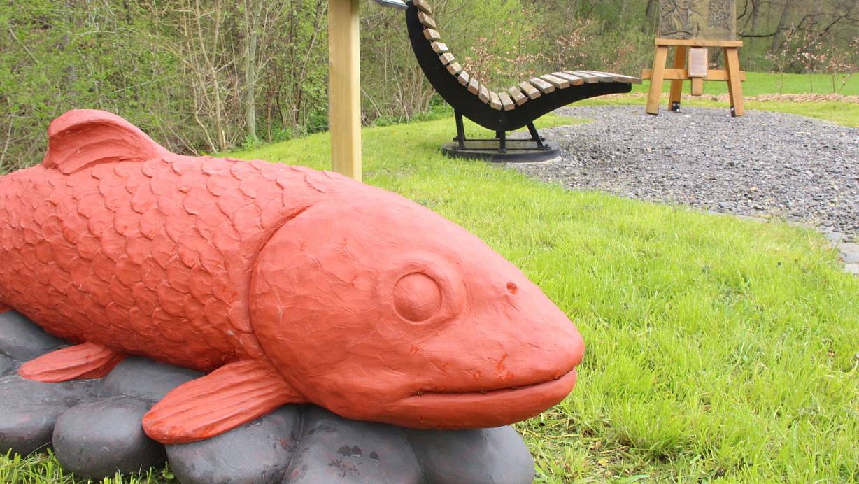 Die Skulptur einer Bachforelle ist am Wisea-von-Westpalen-Platz am östlichen Ortseingang aus Richtung Peckelsheim an der Helmerte platziert. | © Burkhard Battran
