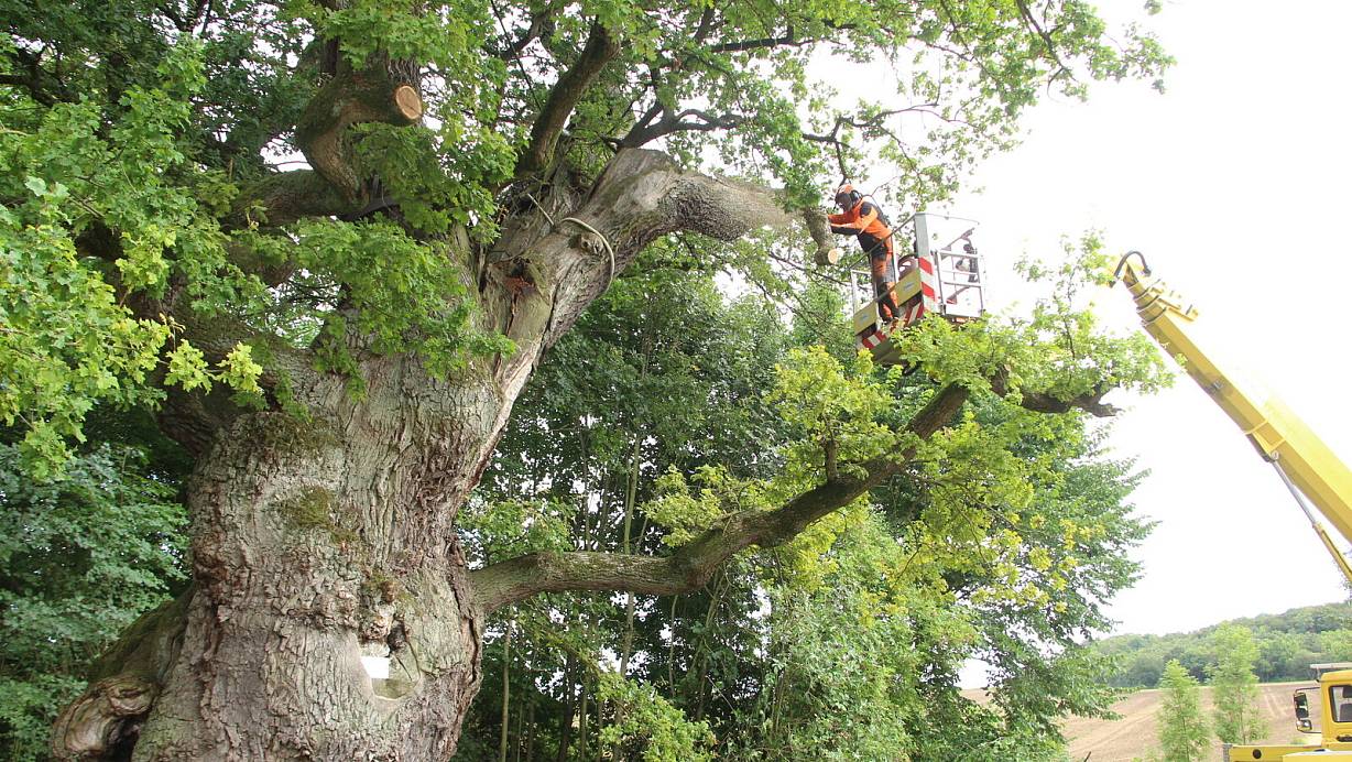 Die Pflegearbeiten sollen die Tausendjährige Rieseneiche bei Borlinhausen vor dem Auseinanderbrechen bewahren. | © Burkhard Battran
