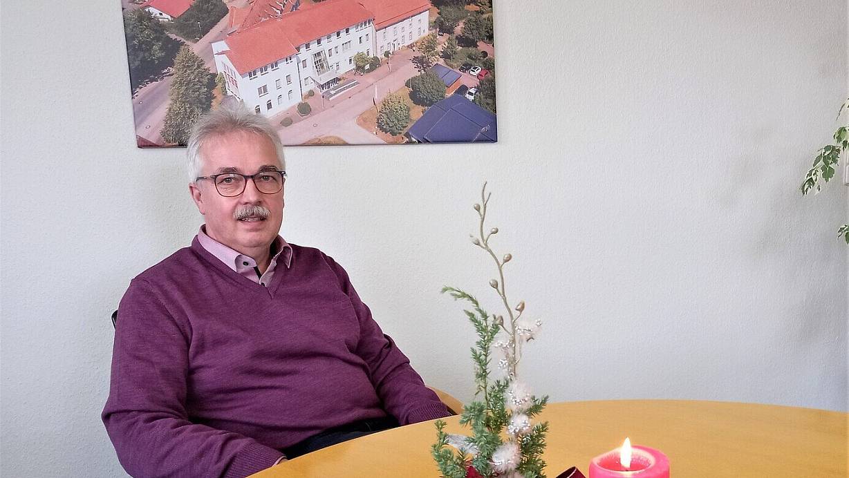 Seit gut einem Jahr ist Norbert Hofnagel Bürgermeister in Willebadessen. Das Foto zeigt ihn im Büro unter dem Foto des Rathauses der Stadt in der Zehntscheune in Peckelsheim. | © Simone Flörke