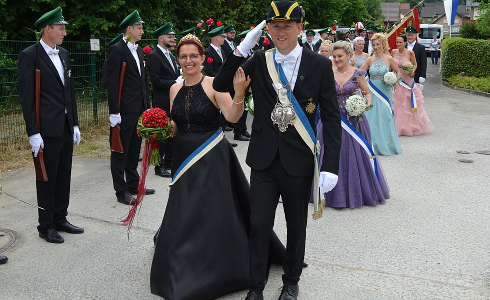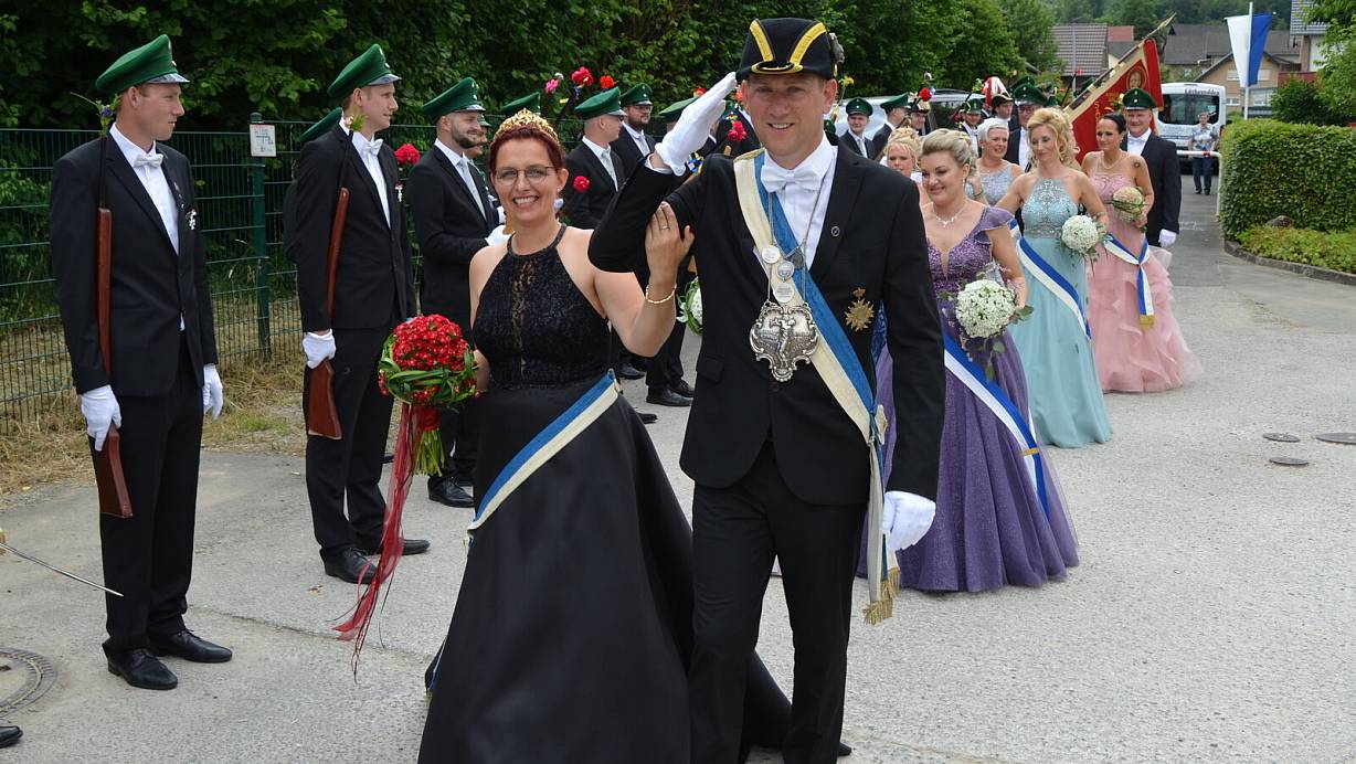 Dort wurde der König der St. Sebastian-Schützenbruderschaft – Nico Überdick (42) mit Ehefrau Andrea – abgeholt. Dem Hofstaat gehören an: Oberst Jörg Mackenbach mit Ehefrau Vanessa, Königsoffizier und Cousin des Königs Oliver Überdick mit Ehefrau Astrid, Adjutant Uwe Cebul mit Ehefrau Heidrun, Schäffer Elmar Lüke mit Ehefrau Julia und Fähnrich Eugen Diring mit Ehefrau Katharina.