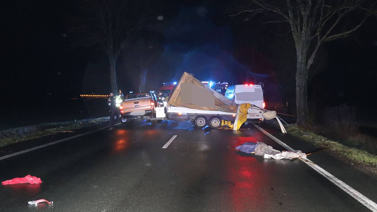 Eine Böe erfasst den Anhänger, das Gespann kommt daraufhin ins Schlingern. Zwei Personen werden verletzt, die B252 wird gesperrt.