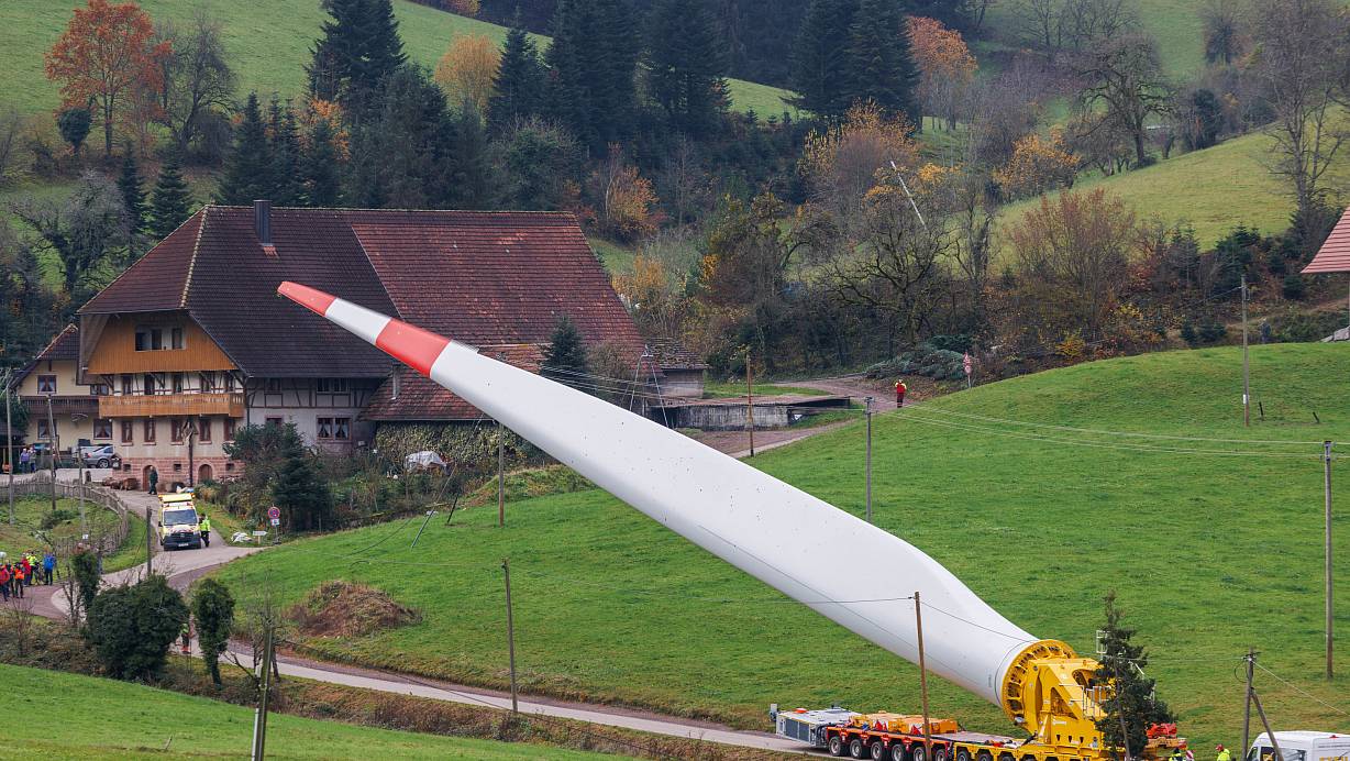 Ein Flügel eines Windrads ist auf einem sogenannten Selbstfahrer montiert und wird über die Straße wie hier in Baden-Württemberg auch durch Ortschaften transportiert. | © Philipp von Ditfurth/dpa