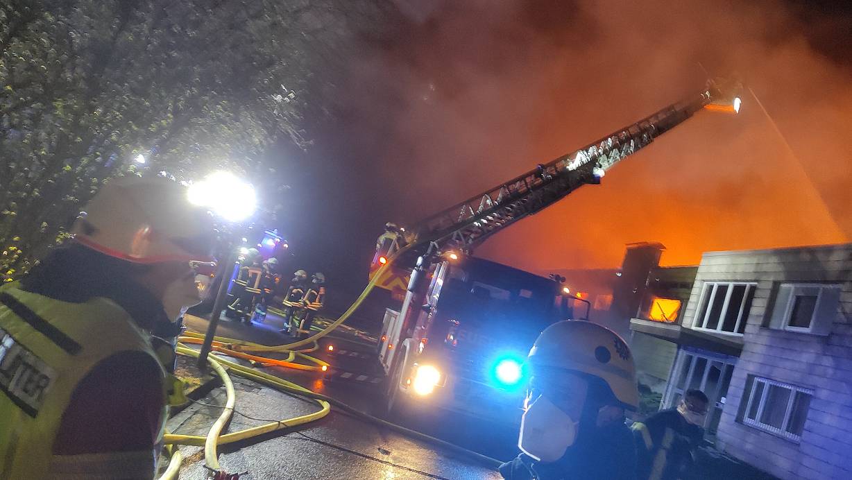In den frühen Morgenstunden des Karfreitag steht in Willebadessen eine Lagerhalle in Vollbrand. Gelöscht wird unter anderem per Drehleiter. | © Svenja Ludwig