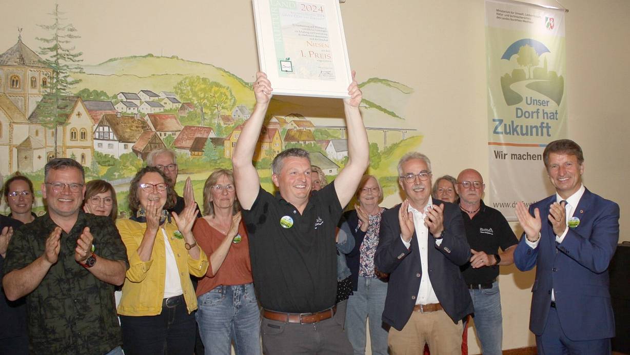 „Die Bürgerinnen und Bürger haben Verantwortung übernommen und ihre wertvolle Freizeit investiert, um ihre Heimat noch lebens- und liebenswerter zu machen. Das verdient höchste Anerkennung“, lobte Landrat Michael Stickeln. Es war die Szene des Abends, als Markus Hagemann, der Ortsbürgermeister von Niesen, die Siegerurkunde für Platz eins ganz weit nach oben reckte. Umgeben war er dabei von glücklichen Mitbürgerinnen und- bürgern. „Niesen ist ein Dorf voller Energie. Das haben unsere Teilnahme an diesem Wettbewerb und der erste Platz noch einmal nachhaltig unterstrichen. Wir haben in vielerlei Hinsicht viel Energie investiert und freuen uns sehr über die ganz besondere Auszeichnung“, so Hagemann.