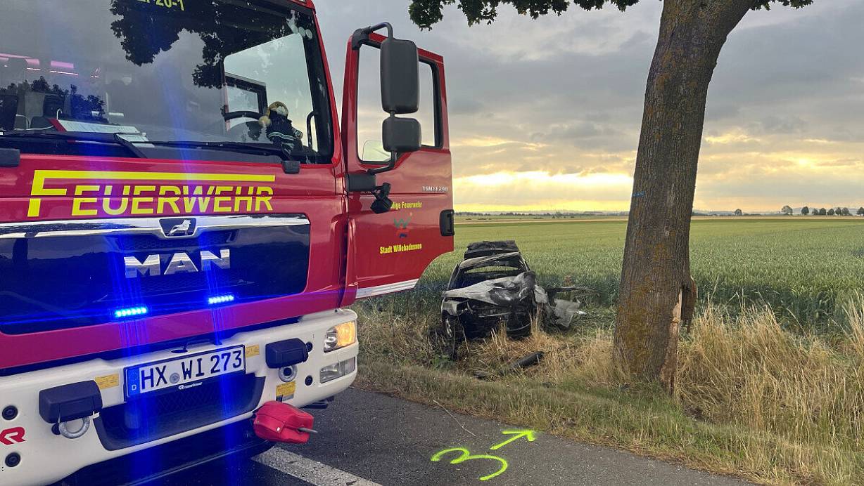 Der Saab prallte auf der Bundesstraße 252 gegen einen Baum und schleuderte dann ins Feld bevor er Feuer fing. | © Feuerwehr Willebadessen