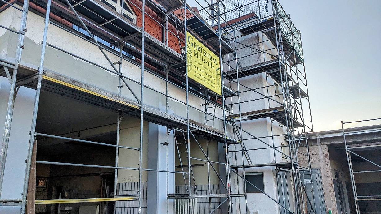 Im vorderen Bereich zur Straße hin, wo die Fahrzeughallen entstehen, ist noch weitgehend Rohbau. | © Burkhard Battran
