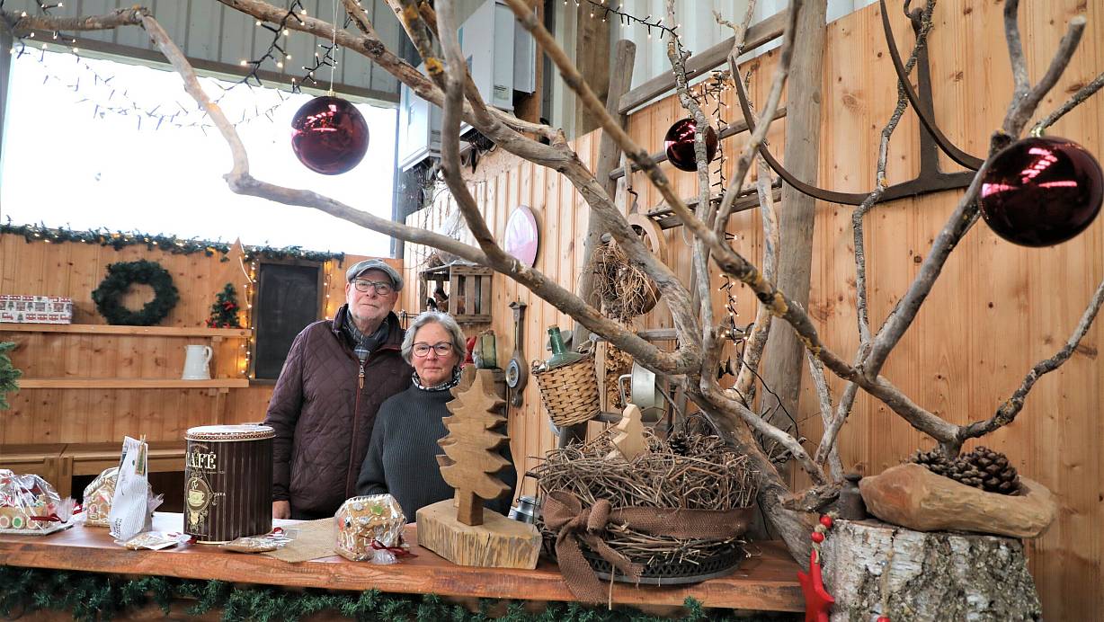 Gertrud und Jürgen Leppert öffnen ihr „Café Weidenröschen“ im Advent – allerdings in der dekorierten Halle. | © Simone Flörke