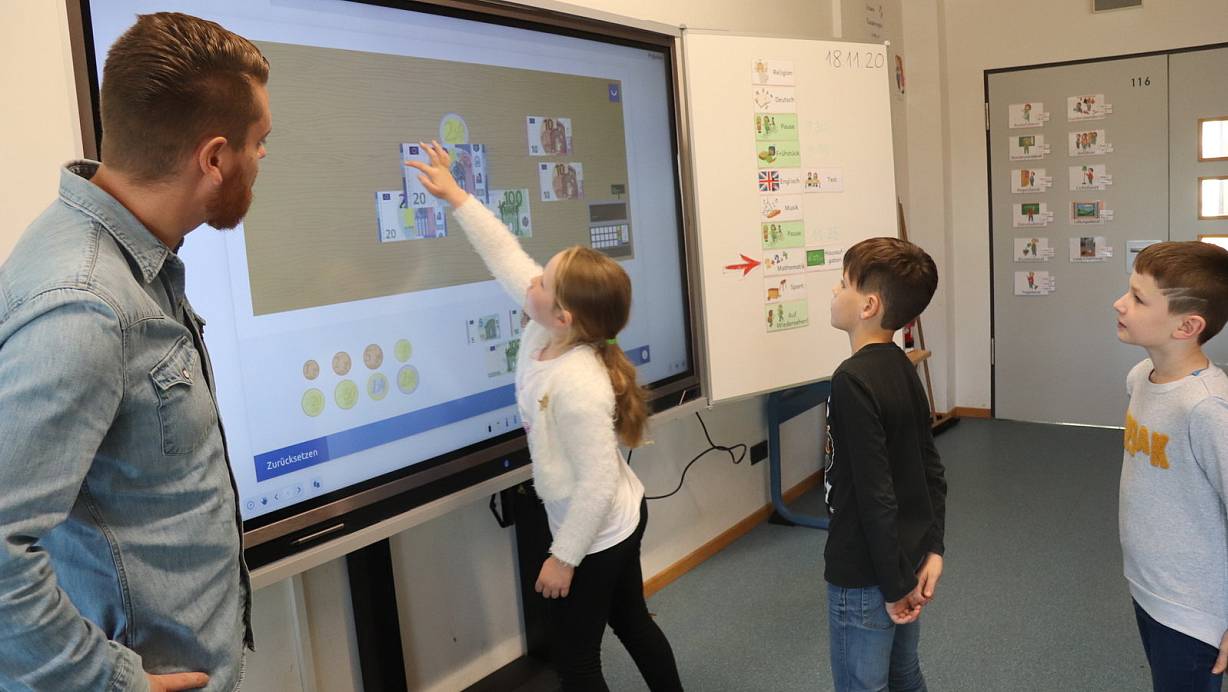 Leopoldshöhe. Drittklässlerin Lara schiebt die Abbildung eines 20-Euro-Scheins auf einen symbolischen Kassentresen, der auf dem Touchscreen in ihrer Klasse zu sehen ist. Dann noch ein paar Euroscheine- und Münzenabbildungen, bis die Summe erreicht ist, die Lehrer Johannes Driediger ihr und ihren Mitschülern Tyler und Mateo vorgegeben hat. Es ist ein Beispiel, was Lehrer und Schüler im Unterricht so alles an diesen neuen Geräten machen können. Und ob sie die richtige Summe zusammengezählt hat, kann Lara mit einer Berührung auf eine symbolische Kasse auf dem Tresen sofort überprüfen. Passt.