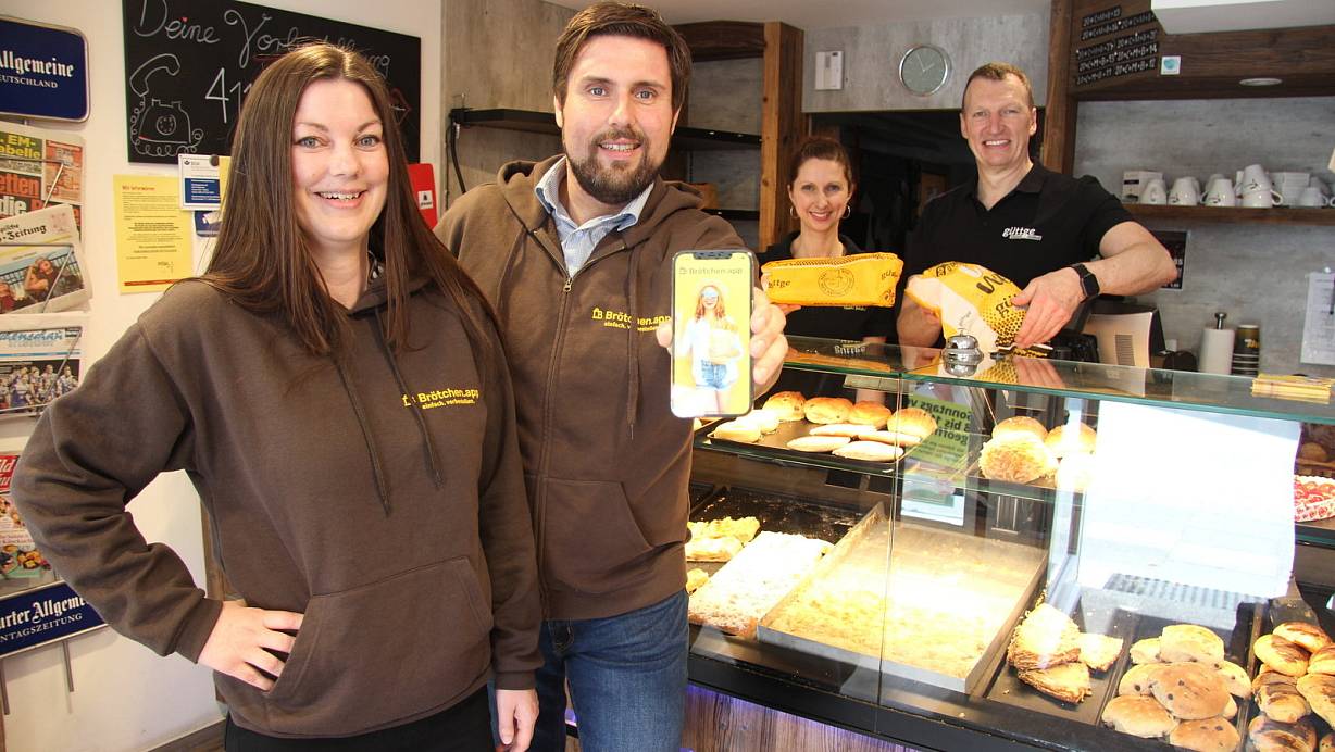 Ann-Katrin Lüttmann und Oliver Güttge (hinten) sind von Anfang an bei der Brötchen-App, die von Jennifer Bremehr und Pierre Jacek aus Leopoldshöhe entwickelt wurde, dabei. | © Kirsten Fuhrmann(LZ)