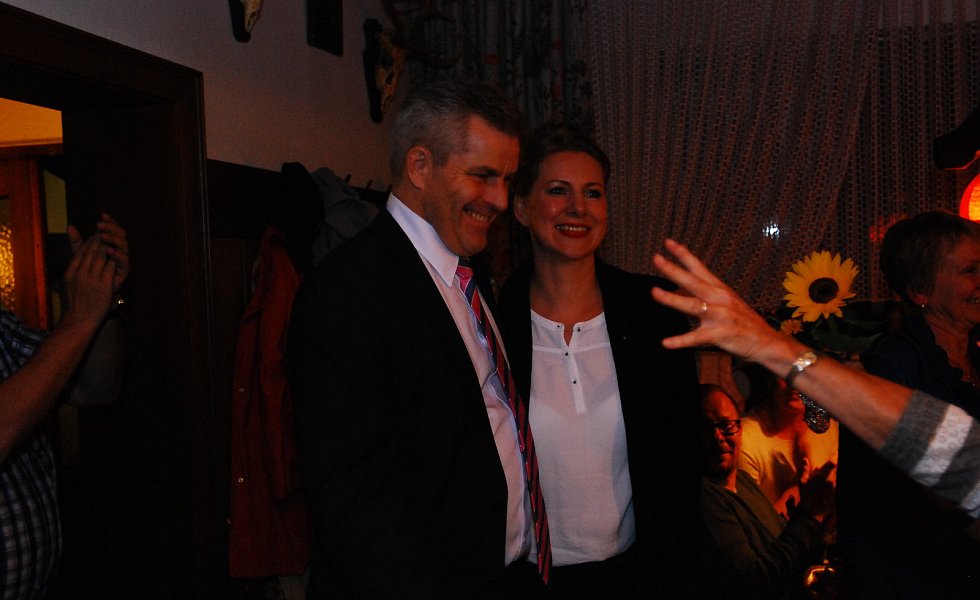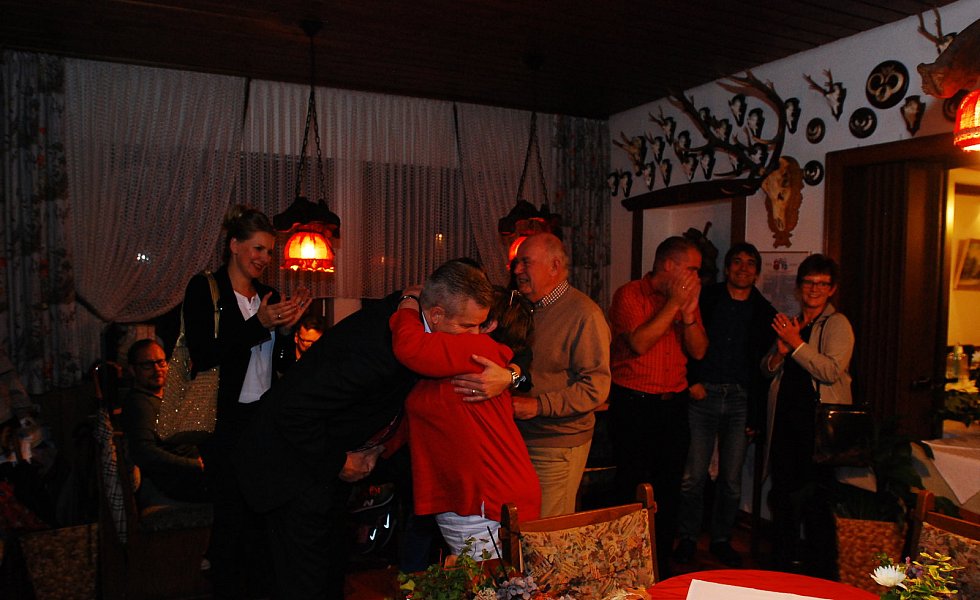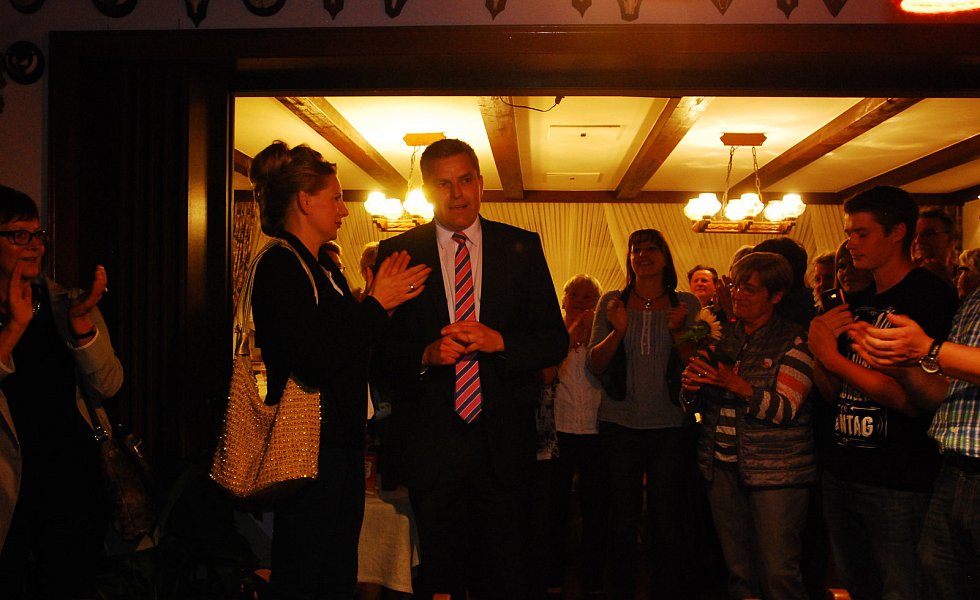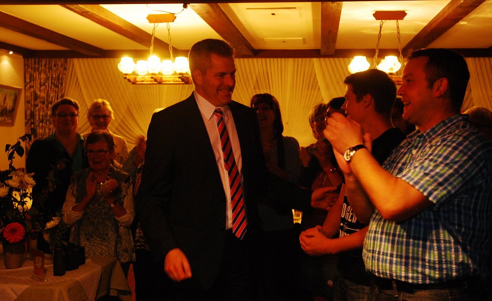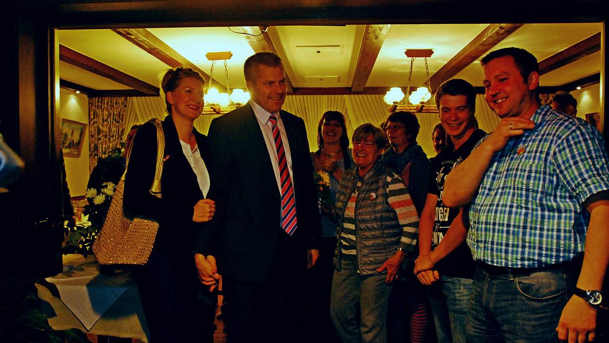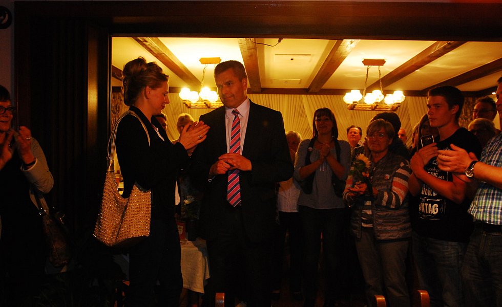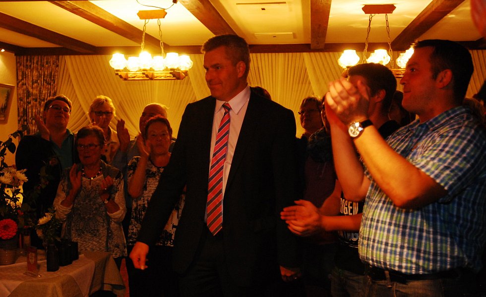 „Es ist die größte Ehre meiner politischen Laufbahn“, sagte Becker mit einem dicken Kloß im Hals – dann kam glücklicherweise der begeisterte Applaus der etwa 400 Bürgerinnen und Bürger, die zur Wahlparty in die Aula des Schulzentrums gekommen waren.