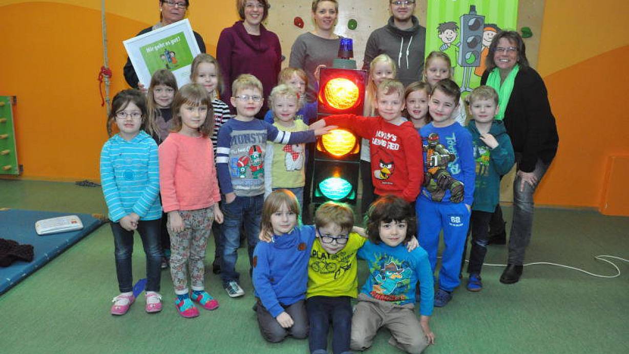 Rund um die Ampel: 21 angehende Schulkinder haben den Selbstbehauptungskursus von Beatrix Burow-Runde (r.) besucht. Unterstützung gab es von Sabine Werner (l.), Christoph Bollhorst, Leiterin Carmen Pöppe (2. v. l.) und der Fördervereins-Vorsitzenden Lena Kampeter (Mitte). | © Karin Prignitz