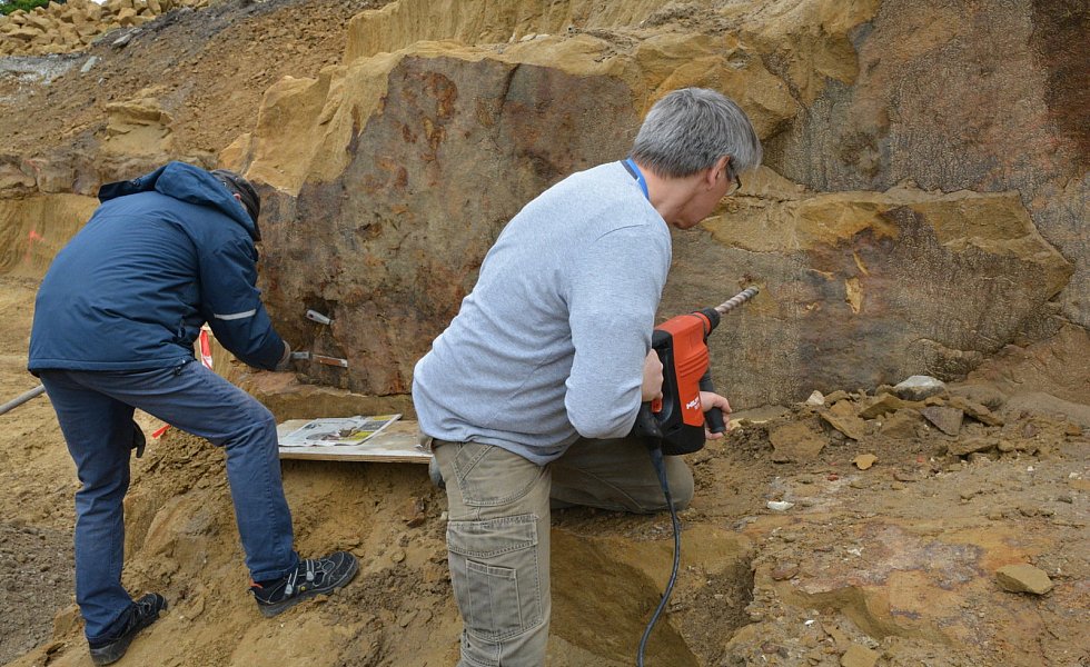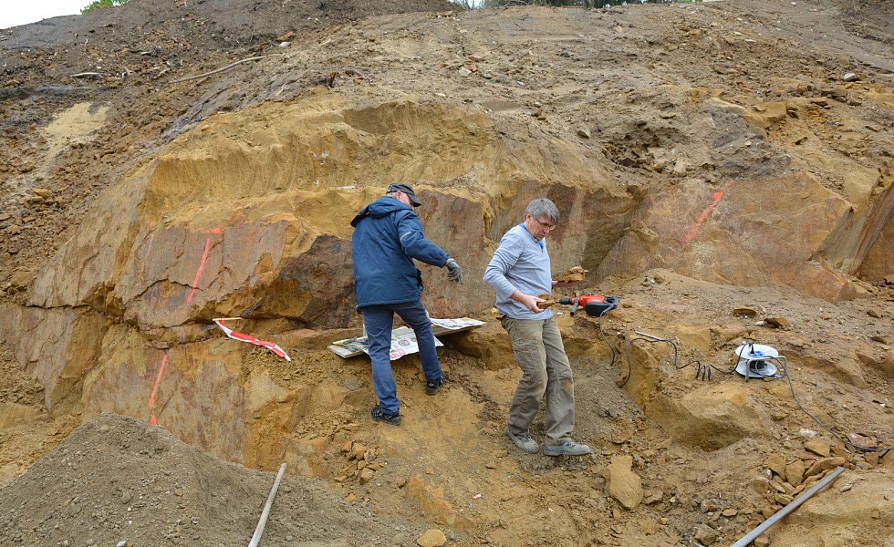 In Oerlinghausen gebe es nun die einmalige Möglichkeit, Belegmaterial zu sichern, „bevor es unwiderruflich vernichtet wird". Den beiden Präparatoren Michael Ludorf und Manfred Schlösser vom Naturkundemuseum Münster gelingt es mit aller Vorsicht, durch Spaltung Fossilplatten abzulösen. „Zum Teil werden wir sie wieder zusammen puzzlen", erläutert Schlösser. Die Geologen bedanken sich, dass sich sowohl die Eigentümer des Grundstückes, auf dem 19 Ferienwohnungen, eine Privatwohnung, Büroräume und eine Tiefgarage entstehen sollen, als auch die Abbruchfirma sehr kooperativ zeigen.