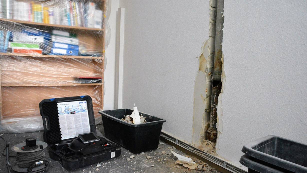 Tom Wormuth von Haustechnik Brüntrup hat bereits ein Rohr in der Wand freigelegt, schaut sich mit einer Kamera das Innere an. Was er sieht, ist alt und kaputt. „Das muss schon lange undicht gewesen sein“, bestätigt der Fachmann den Eindruck von Claudia Hädrich. Unterhalb der defekten Stelle verläuft ein Kabelkanal. Ein Kanalprüfer werde wohl hinzugezogen werden müssen, „und dann müssen wir sehen, wohin die Reise geht“, sagt Wormuth.