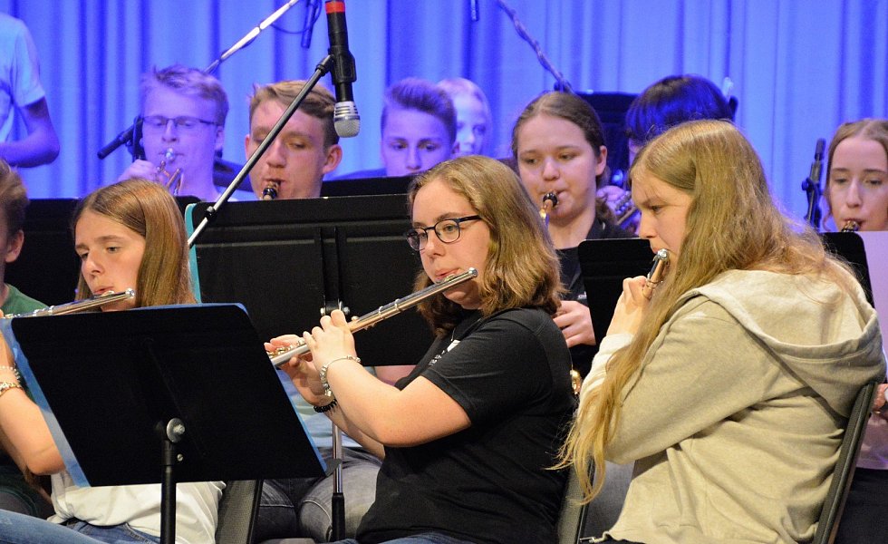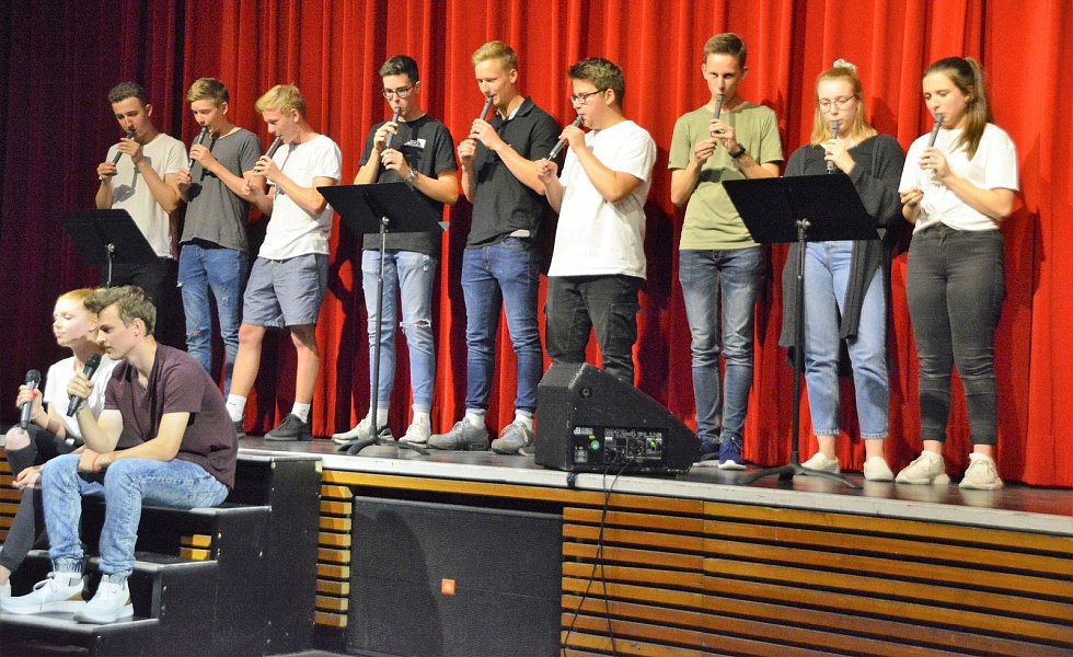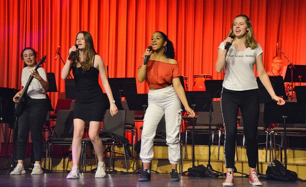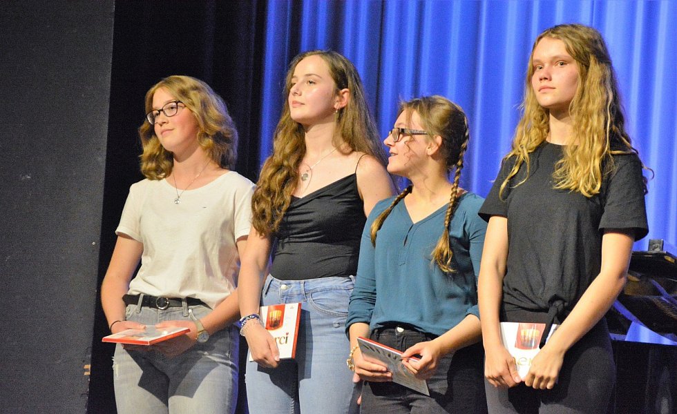 Rapunzel begegnete dort einem jungen Apotheker. „Und wenn sie nicht gestorben sind, dann trinken sie noch heute.“ Ganz andere Töne schlugen die von Matthias Günther („der Mann in Gelb“) geleitete Bläserklasse 5a und die Junior-Big-Band an. Schwungvoll, rockig, voller Energie. So eingestimmt eroberte die Schülerband „RePlay“ die Bühne. Die Sängerinnen Verdiana Celli-Manga, Nele Peters und Jasmin Diekmann sowie Pianistin Lina Henkel, E-Bassistin Antonia Prietzel, Schlagzeuger Jannes Letmathe und Gitarristin Laureen rockten die Bühne und sorgten mit ihrem Auftritt, zu dem zwei vehement geforderte Zugaben gehörten, für den fulminanten Schlusspunkt.