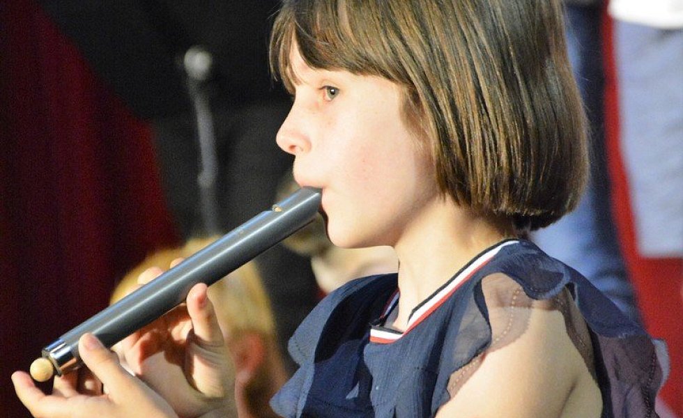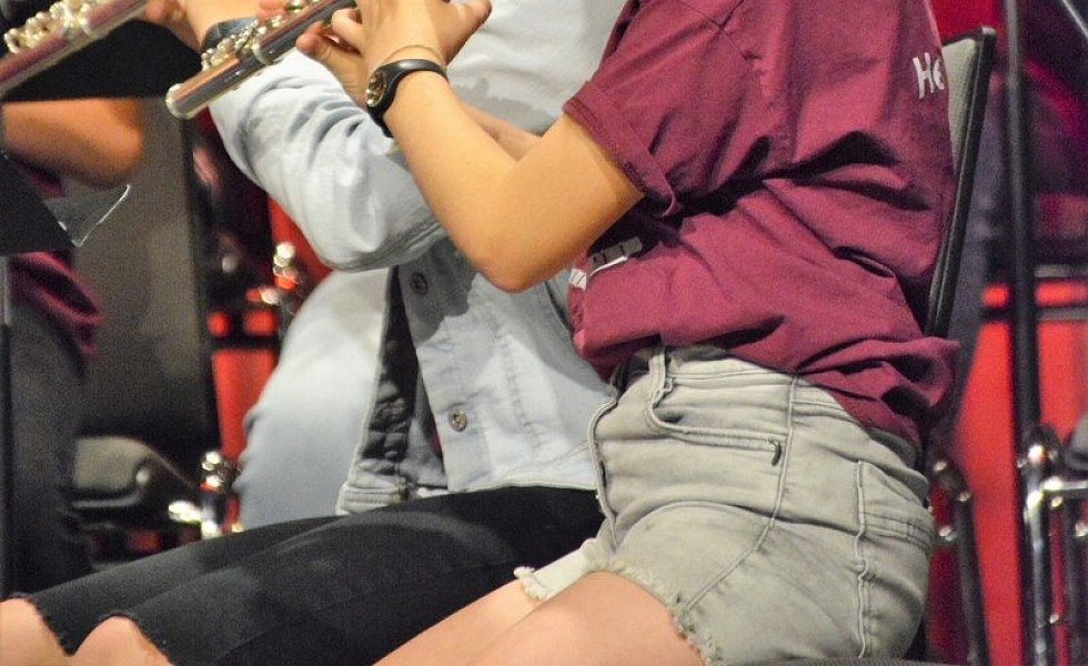 Regina Koop und Maya Wattenberg setzten den Schlusspunkt mit einem selbst choreographierten Tanz. „Diese Tradition wollten wir unbedingt fortführen“, betonte Regina Koop. Für besondere Auftritte bei den NLG-Sommerkonzerten ist der Musikkurs der Q1 von Alfons Haselhorst bekannt. Spannung auch diesmal, was es denn wohl sein würde. Instrument der Wahl war – wer hätte es vermutet – die Lotusflöte. Mit Zugstäben können die Tonhöhen verändert werden. Ihren Auftritt verpackten die Jugendlichen wahrhaft märchenhaft und verlegten die Geschichte von Rapunzel kurzerhand ins Lipperland.